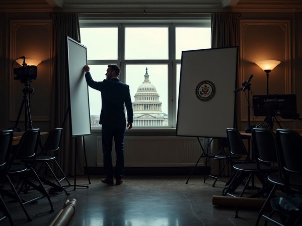 워싱턴 DC 국회의사당 돔이 보이는 가운데, 2025년 2월 25일 캐피톨 힐에서 열린 기자회견 직전 보좌관이 정부 효율성부(DOGE) 코커스 로고가 들어간…